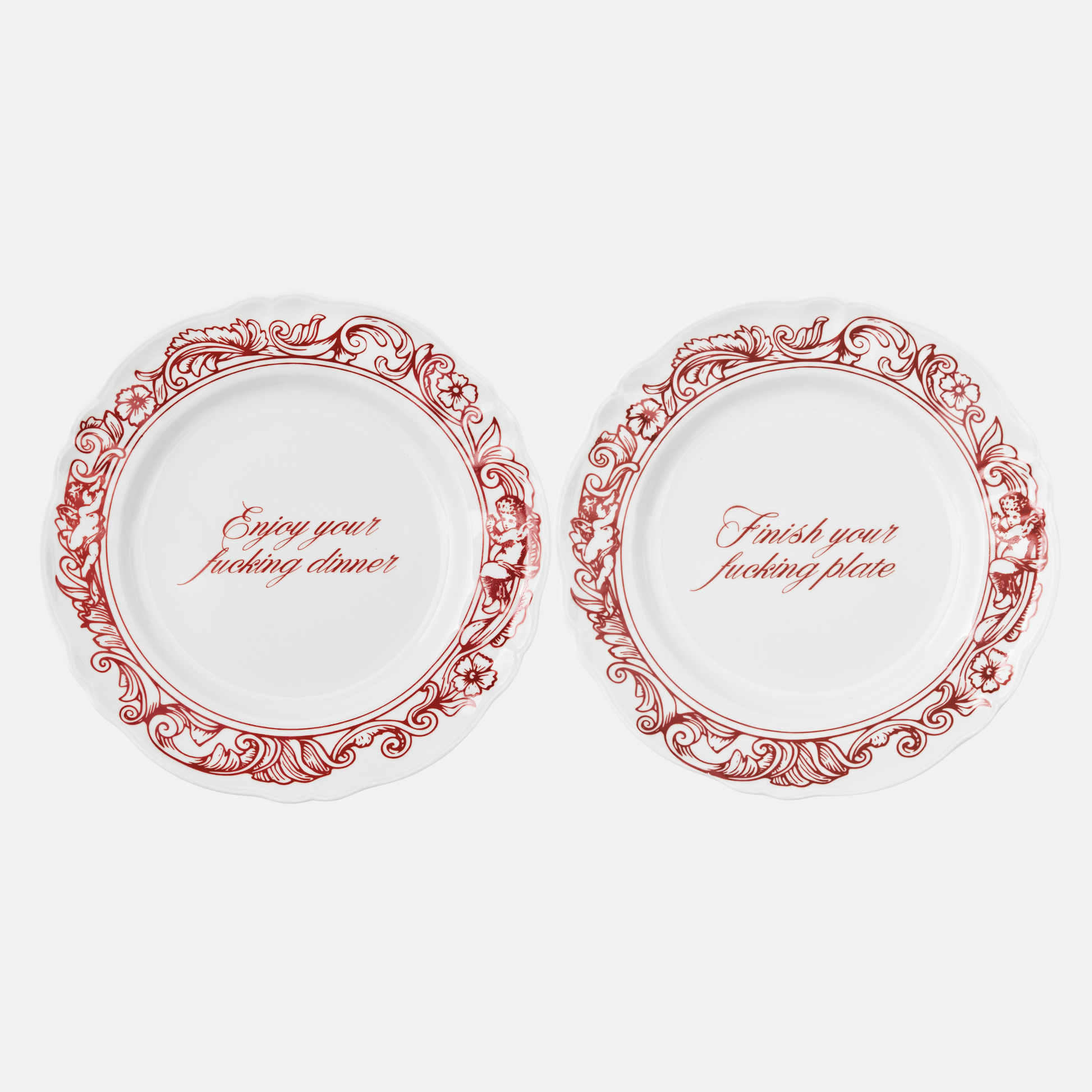 Not your basic plates. These flat statement plates are made to be seen, used, and talked about. Bold messages, cool attitude, everyday durability. Made from high-quality porcelain with a smooth, resistant finish. Dishwasher safe, party approved, and designed for unforgettable tables.